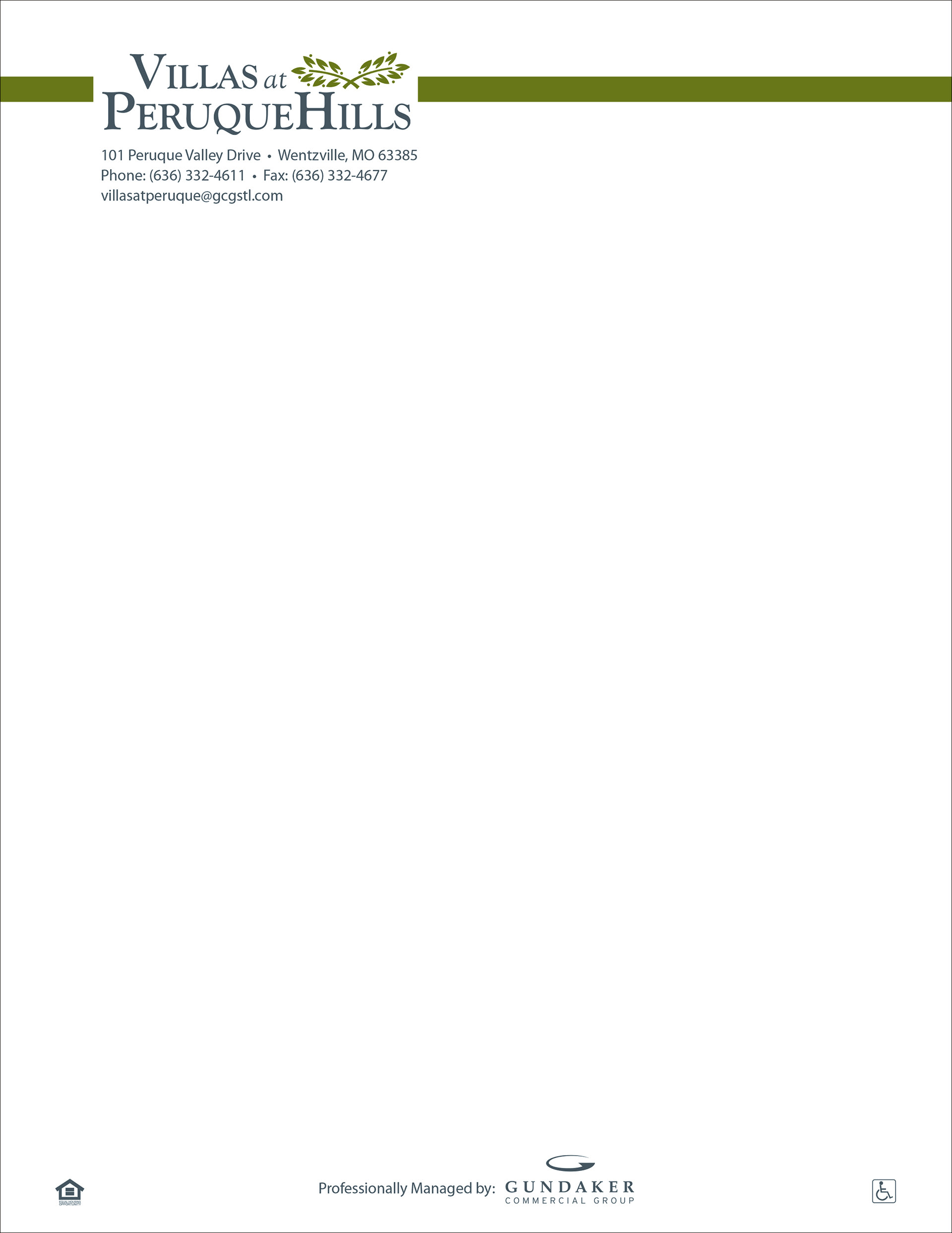 Villas at Peruque Hills is an independent senior living development in Wentzville, MO. contracted by Gundaker Commercial. This project included the logo design, brochures, business cards, letterhead, thank you cards and envelopes.